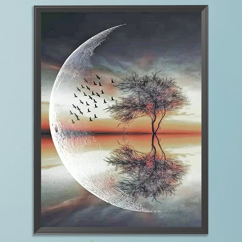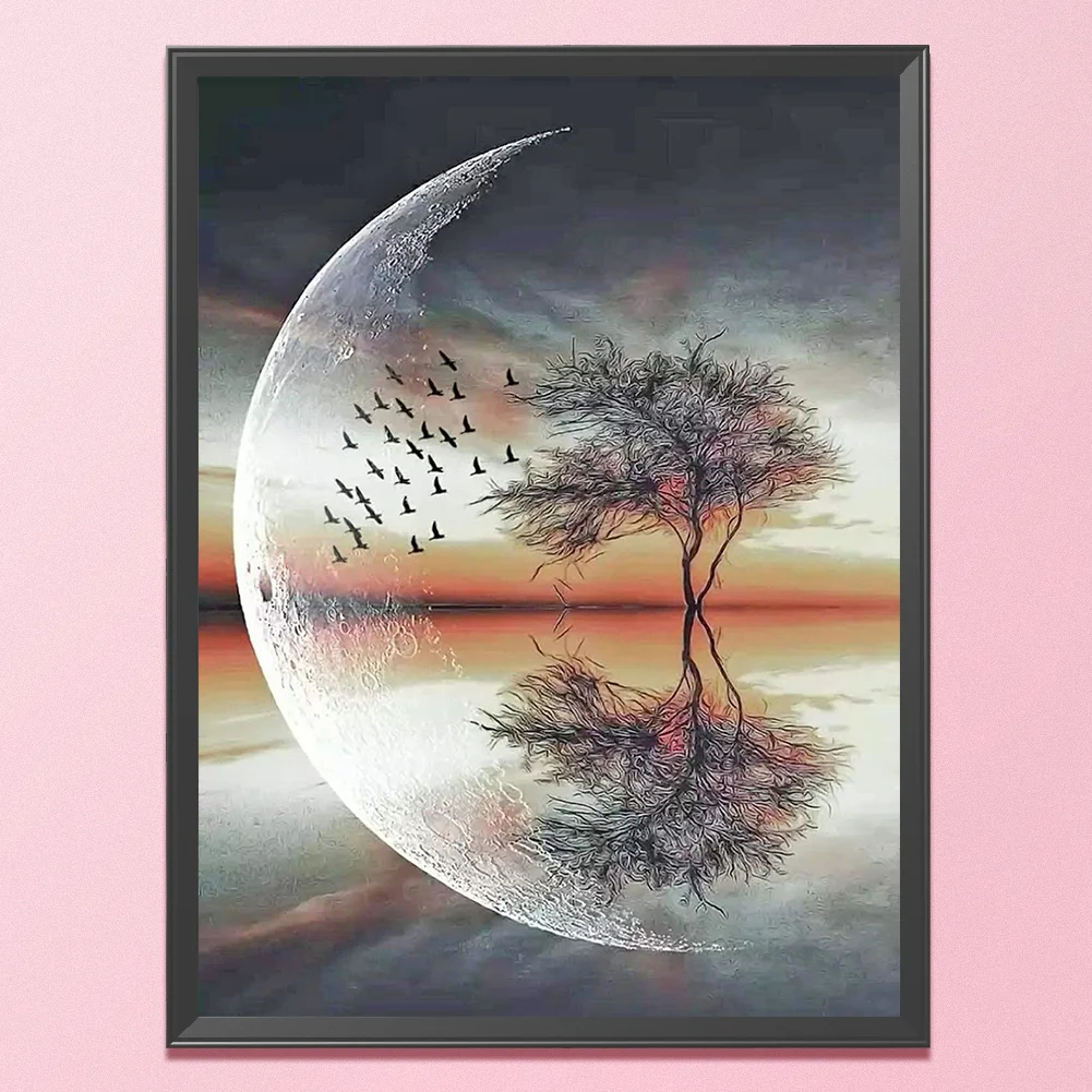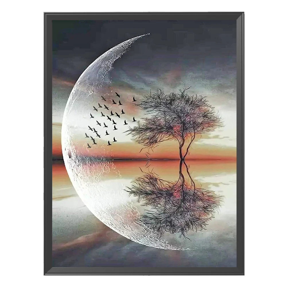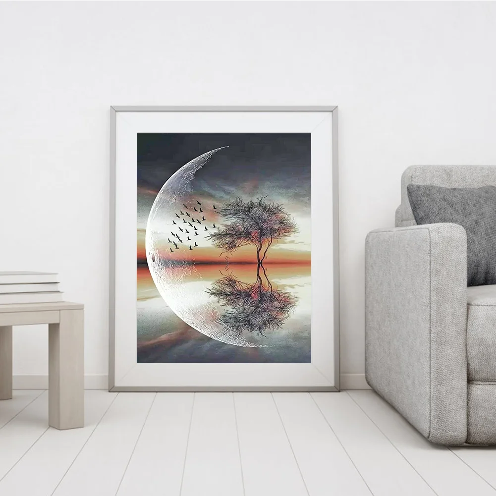 Full Embroidery Stamped Cross Stitch Kits Moon and Tree 3-Strand Cotton Thread 11CT Pre Printed Fabric Needlework DIY Sets Crafts Home Decoration