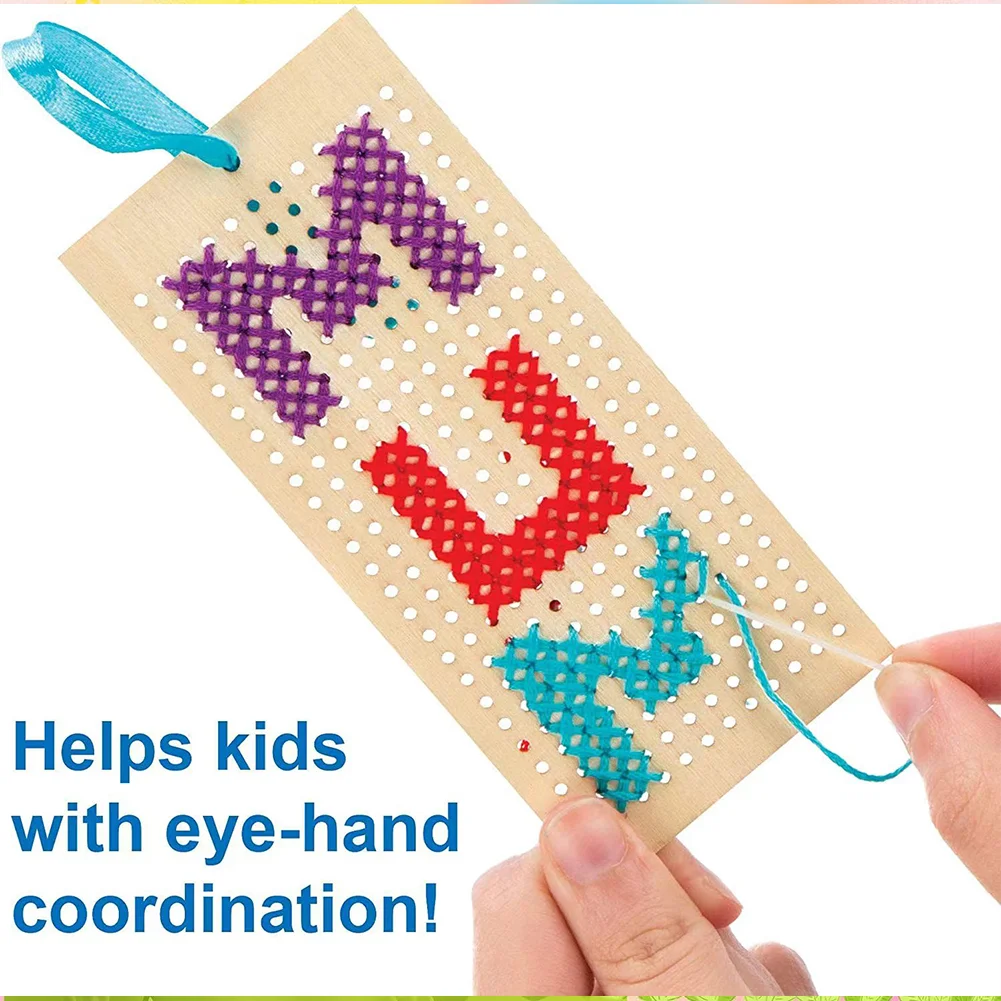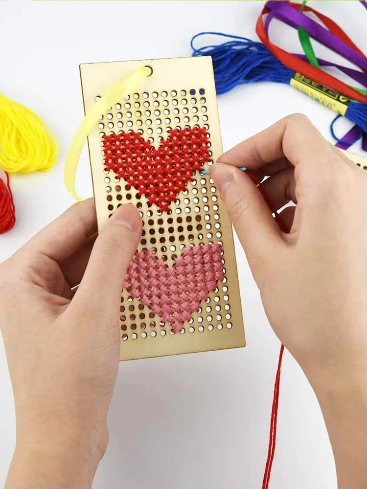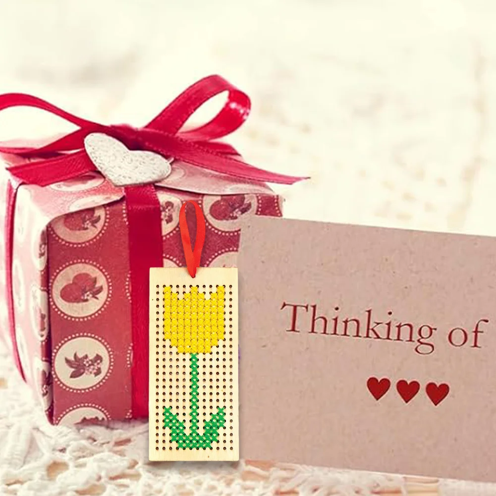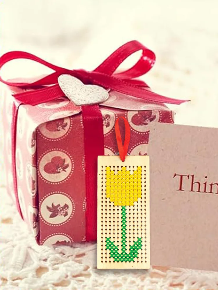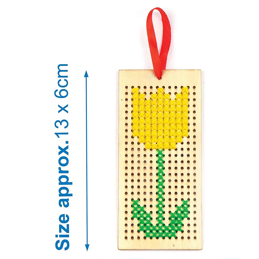 The package content : 4 Blank Wooden Bookmarks + 5 Colors Embroidery Threads + 4 Ribbons + 2 Plastic Needles