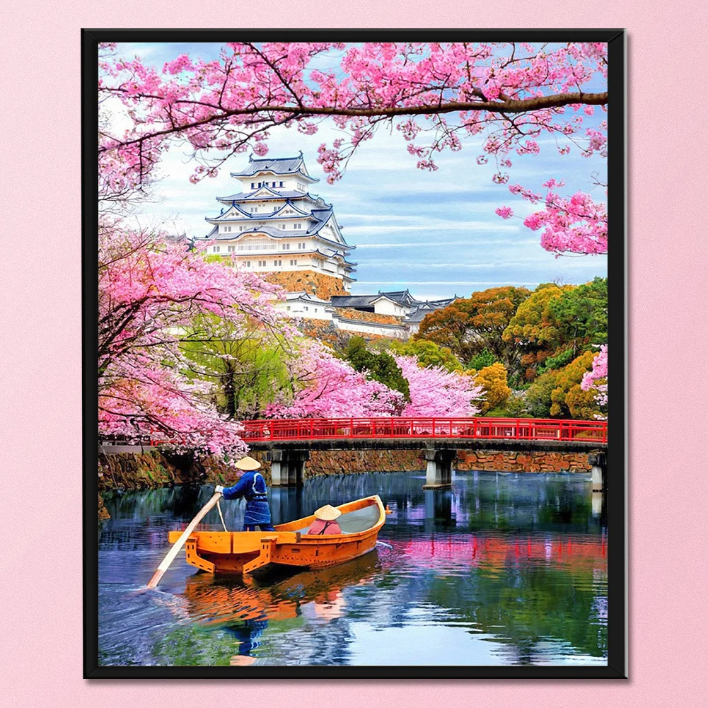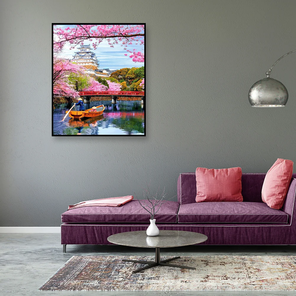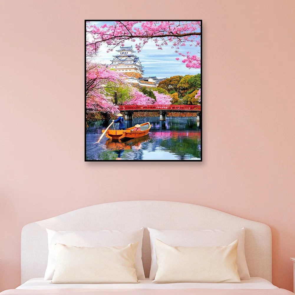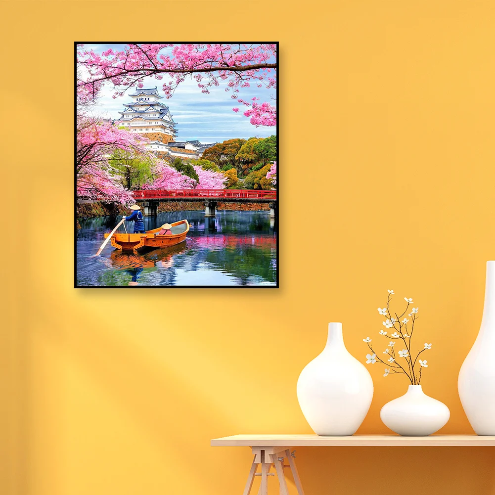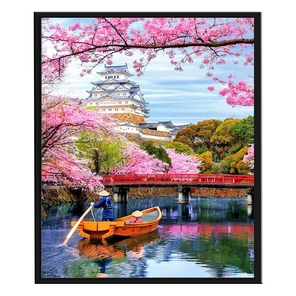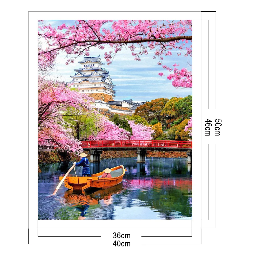 11CT 40x50cm 3 Strands Printed DIY Cherry Blossom Bridge Scenery Thread Stamped Cross Stitch Needlework Set Full Embroidery Kits Art Needlework Home Decoration
