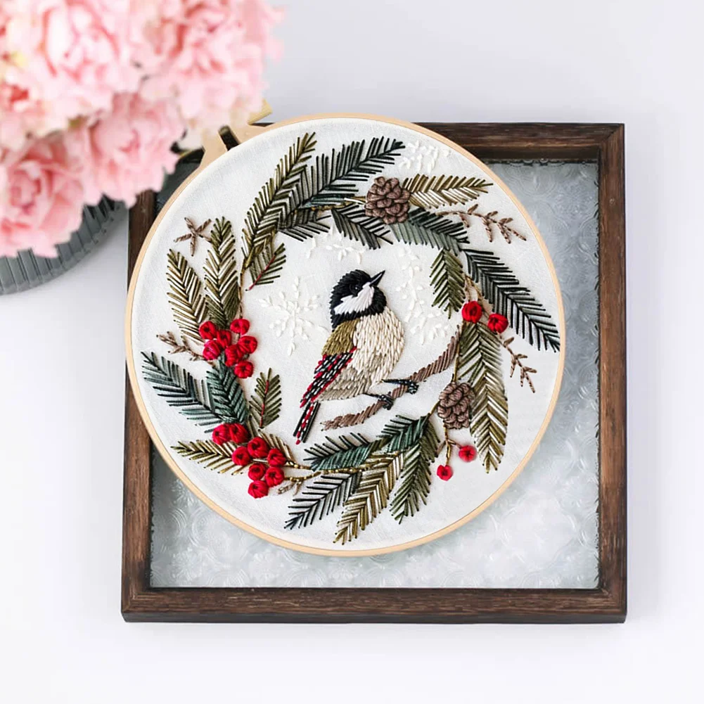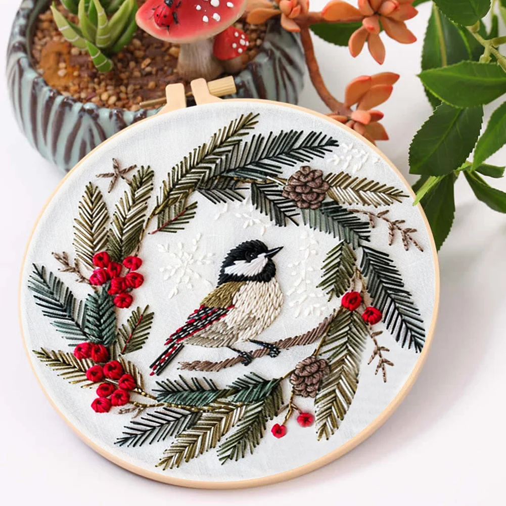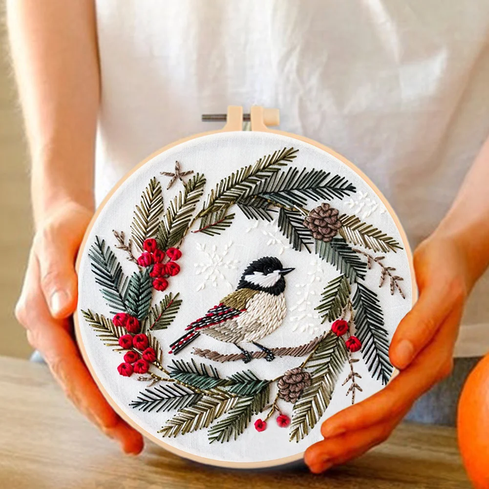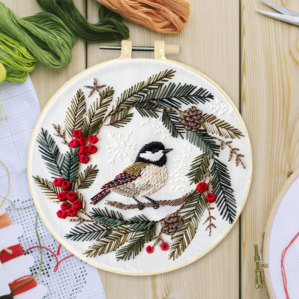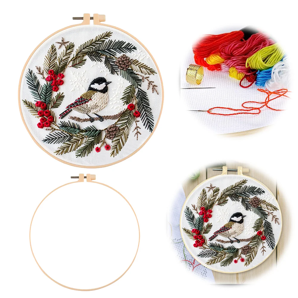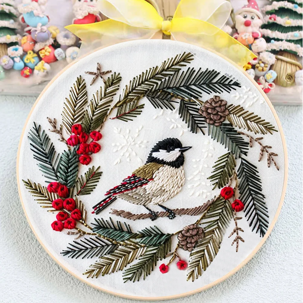 Christmas Bird DIY Embroidery Craft Kit with Pattern Cotton Threads Needles Hoop