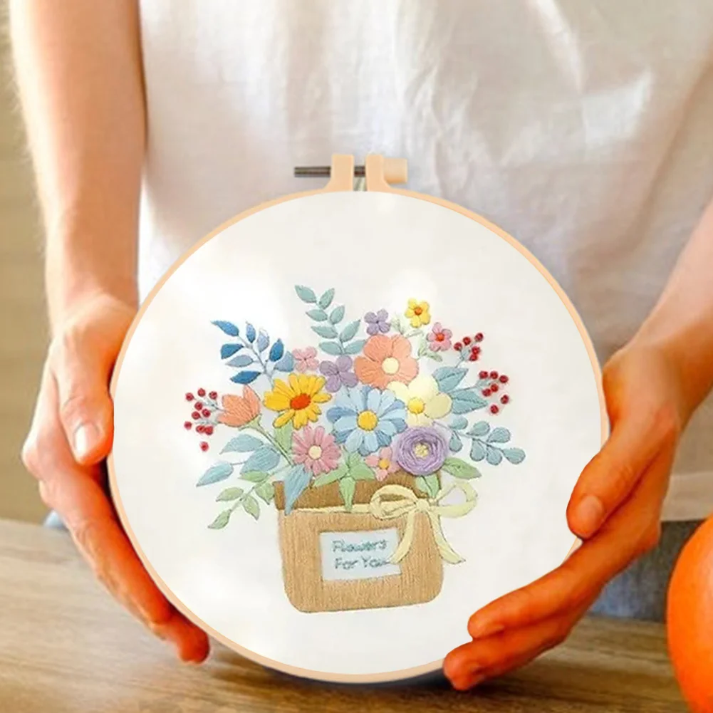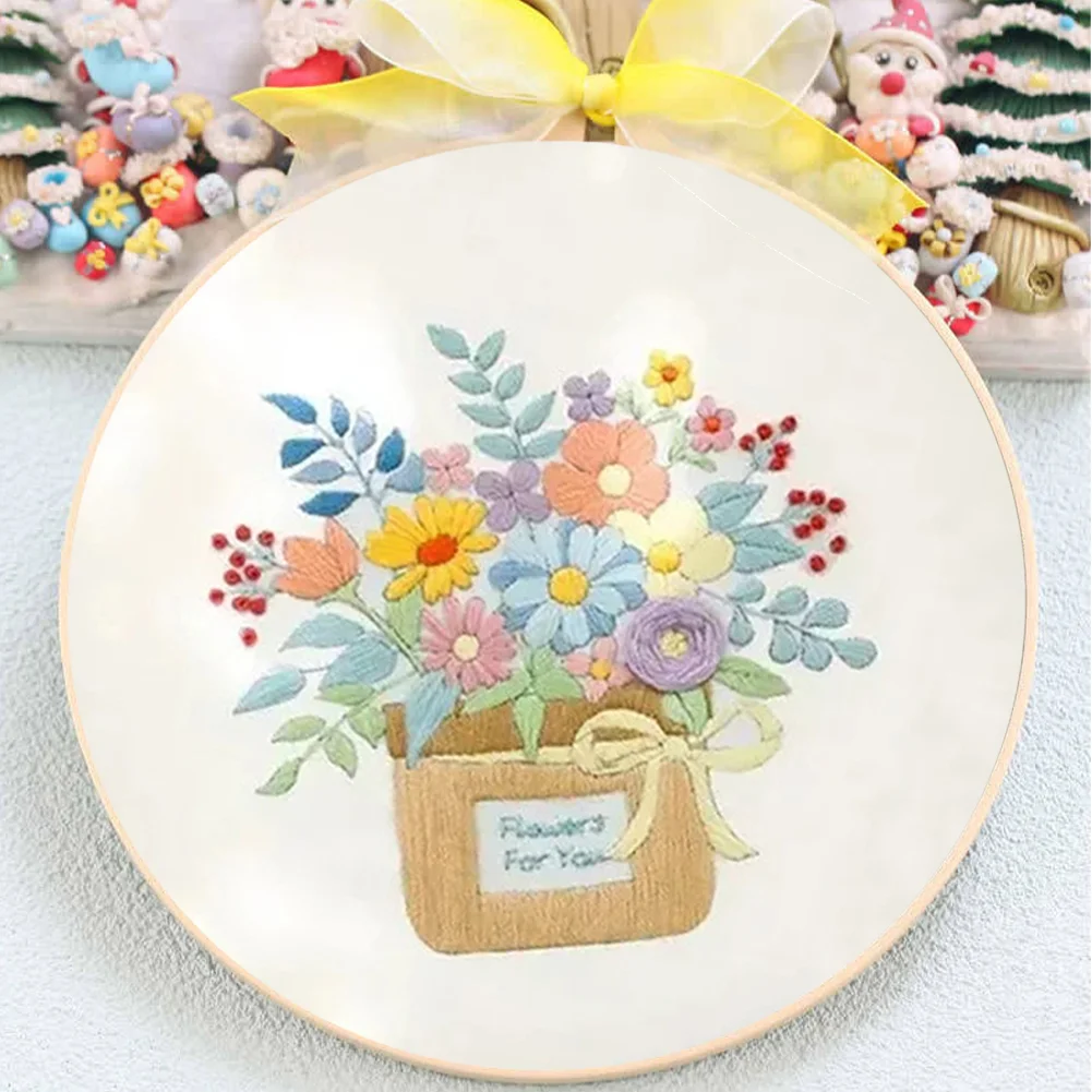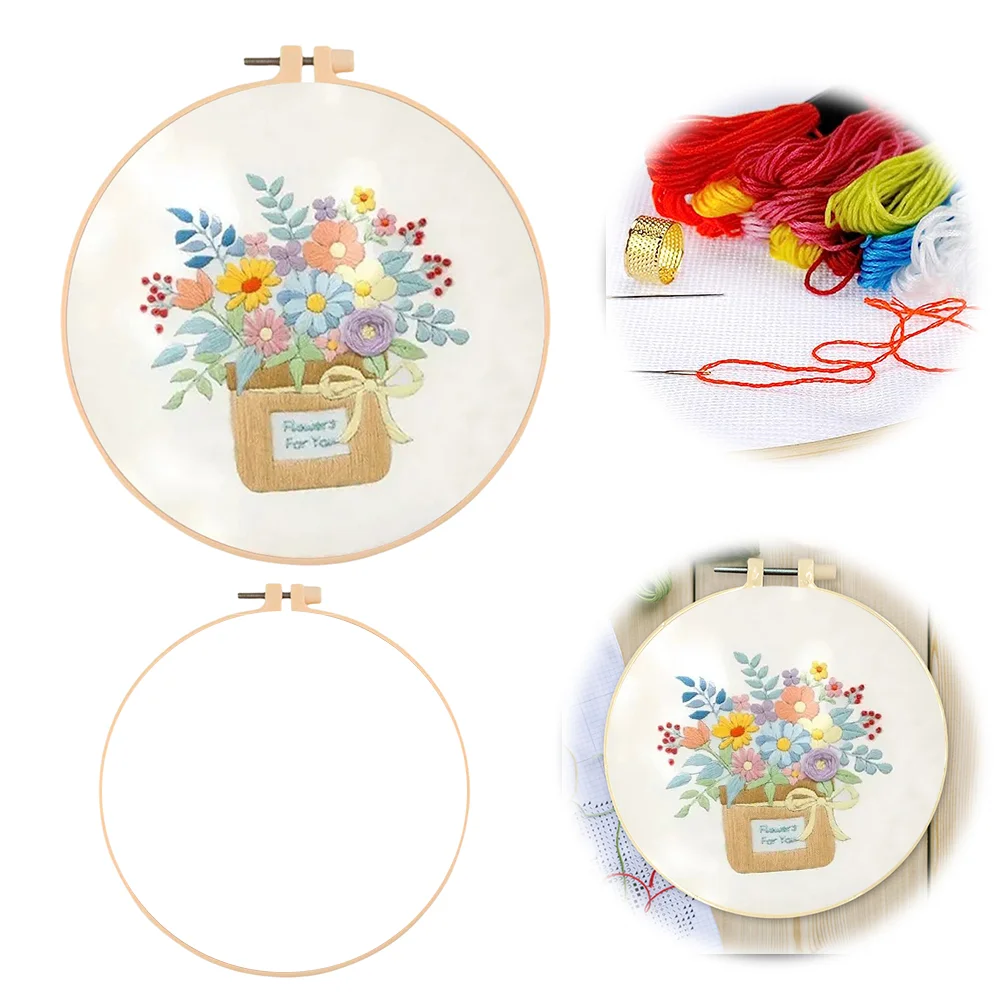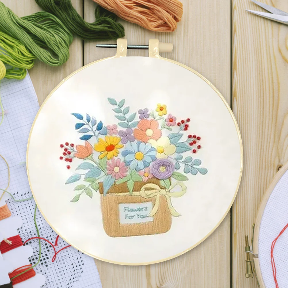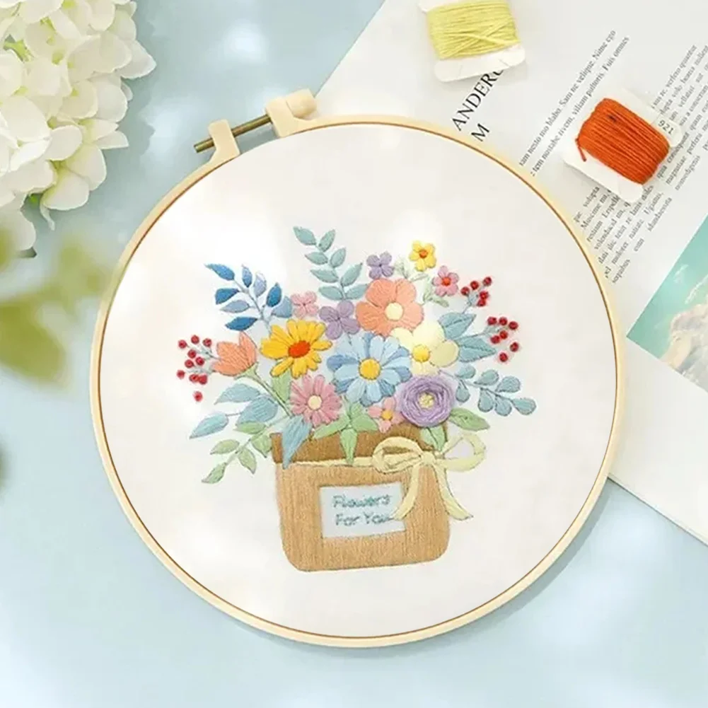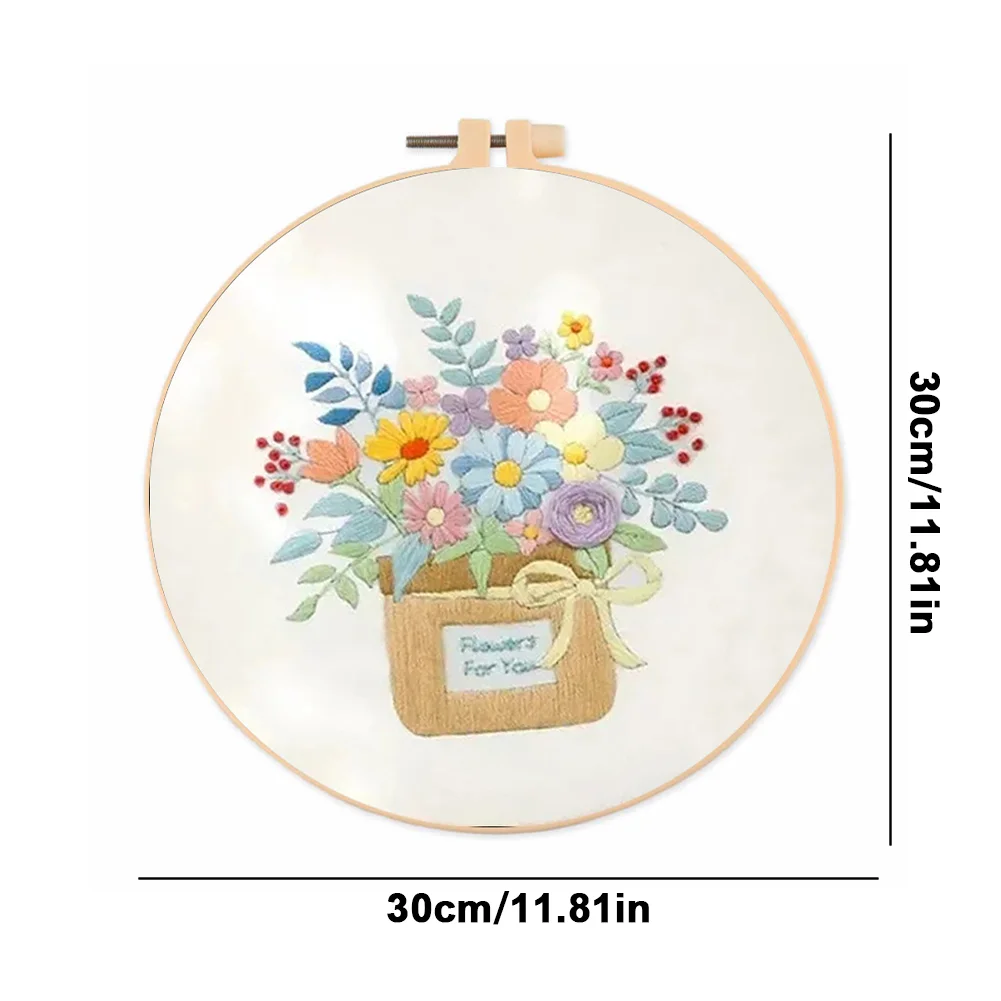 Flower DIY Embroidery Kit with Pattern Cotton Threads Needles Hoop