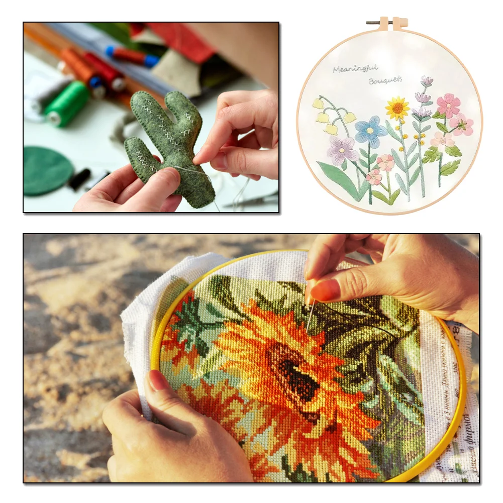 1. Embroidery starter kit, including all needed tools; printing cloth, embroidery thread, imitation bamboo embroidery stretcher, embroidery needles, instructions