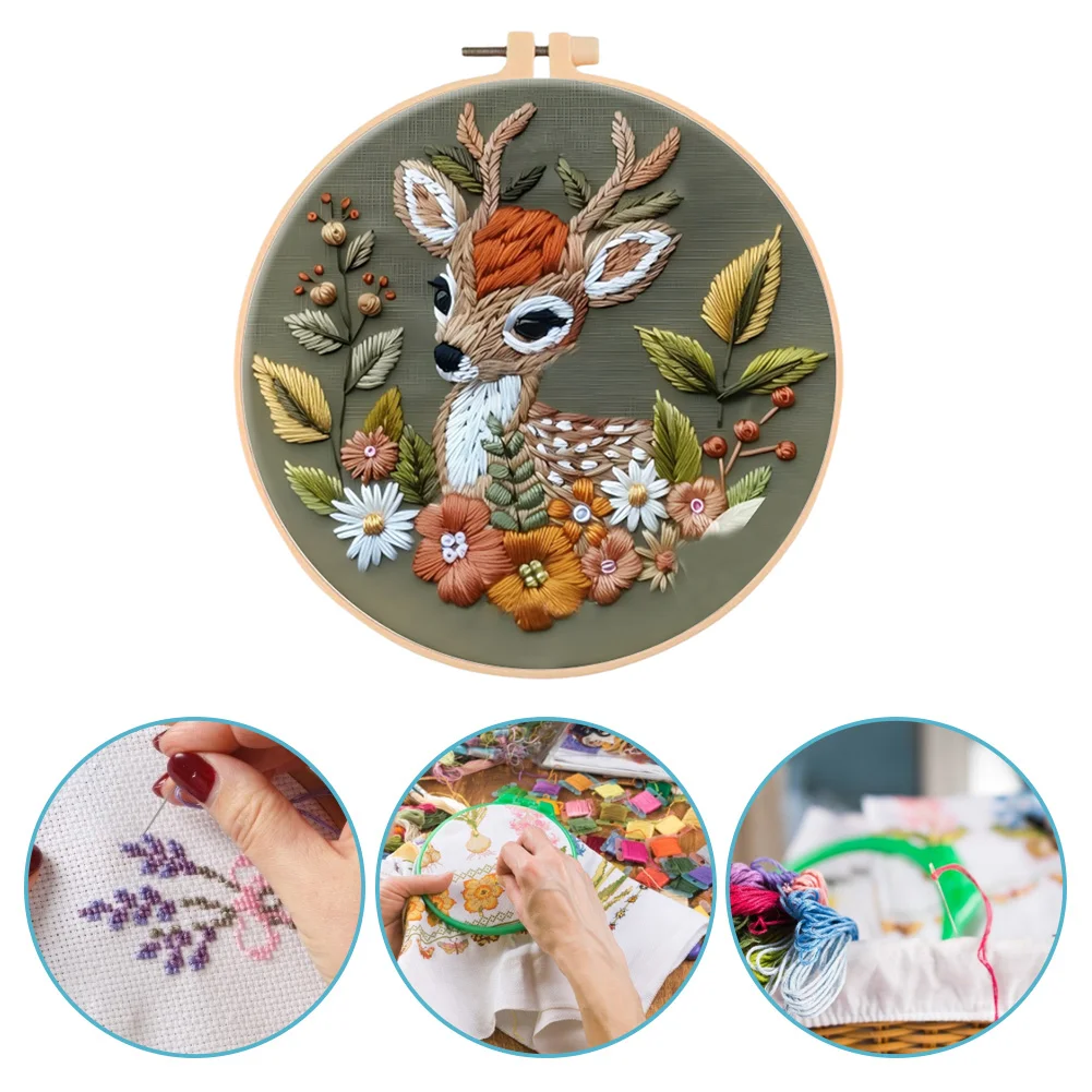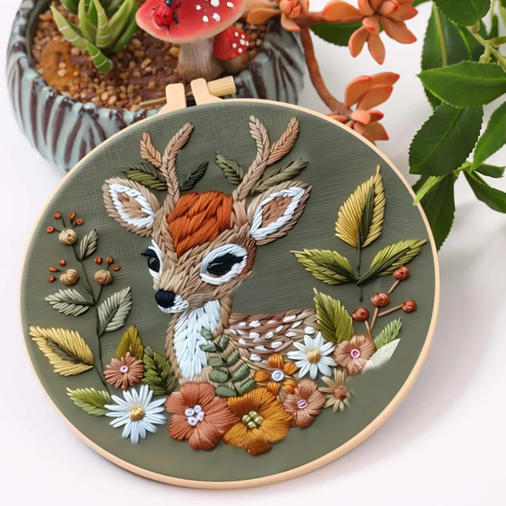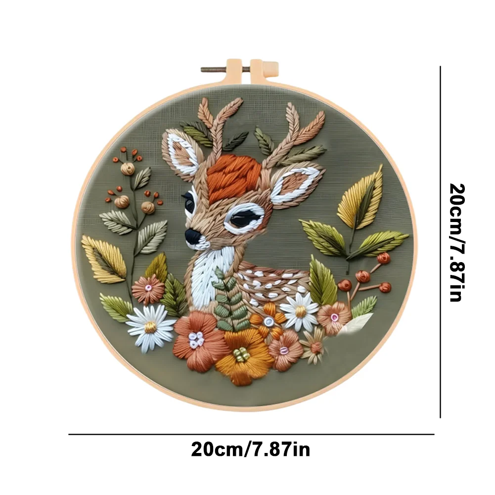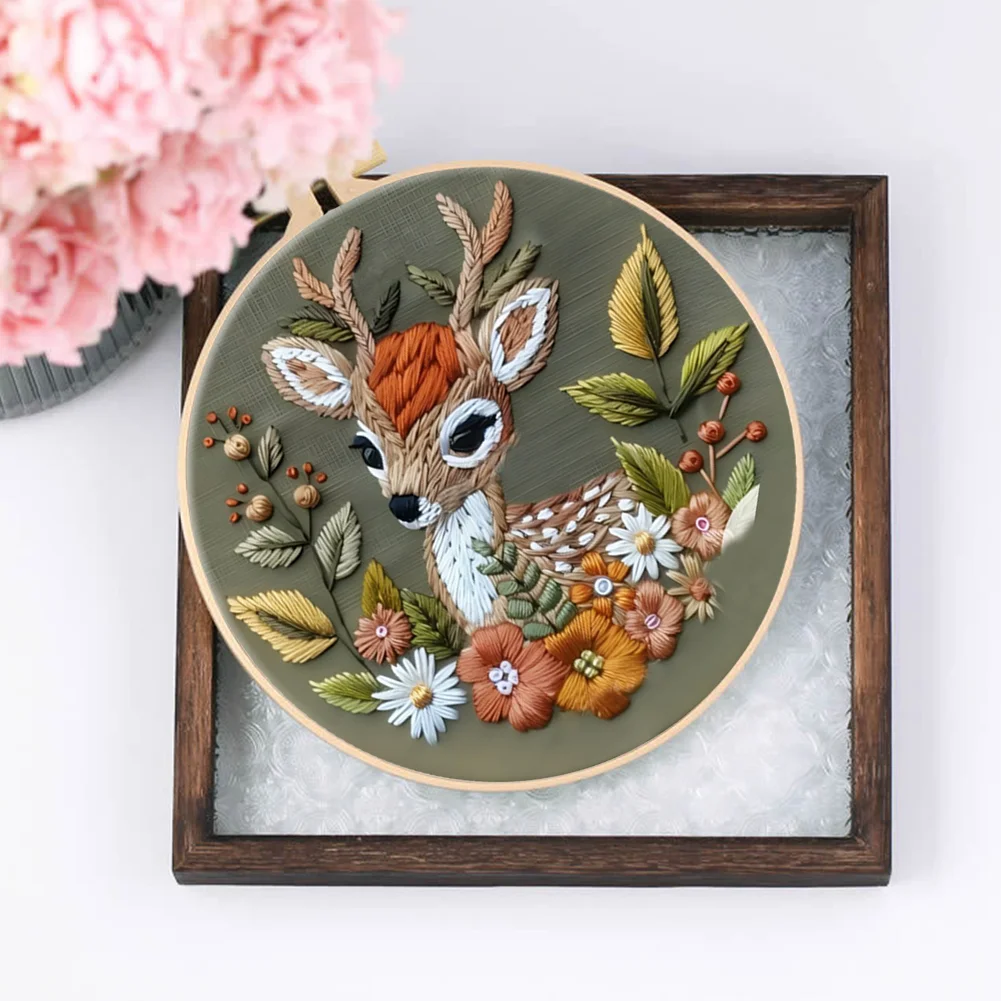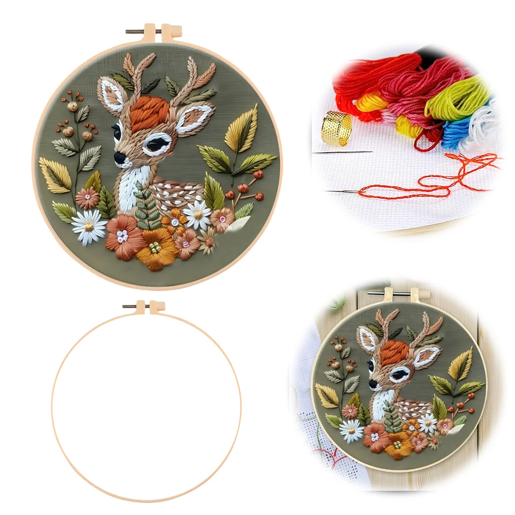 Flower Fawn DIY Embroidery Kit with Pattern Cotton Threads Needles Hoop