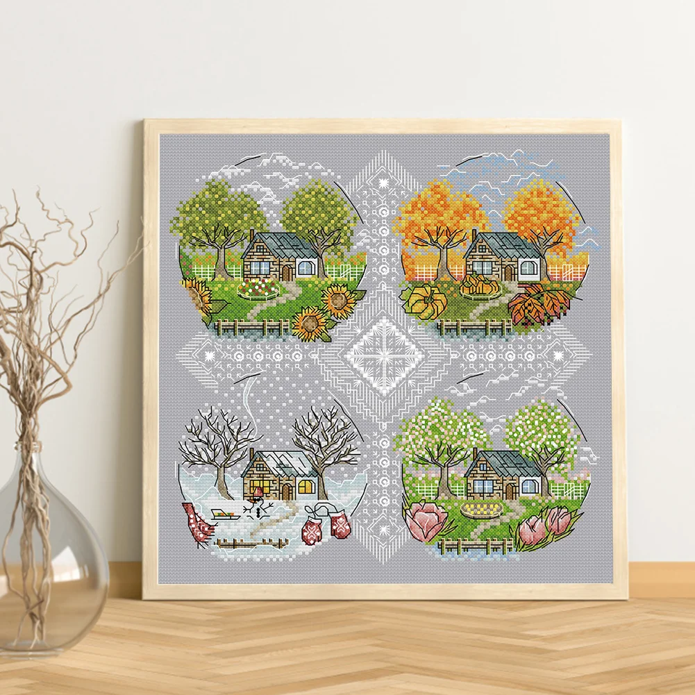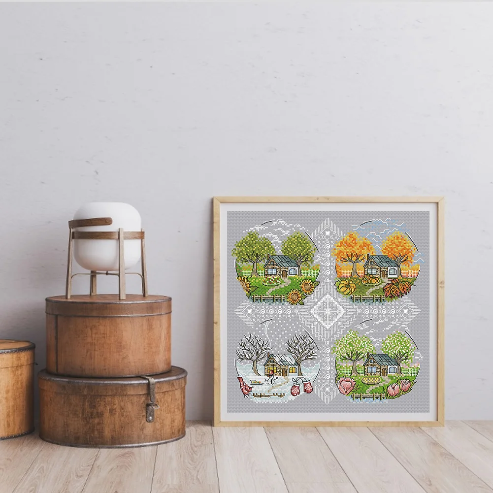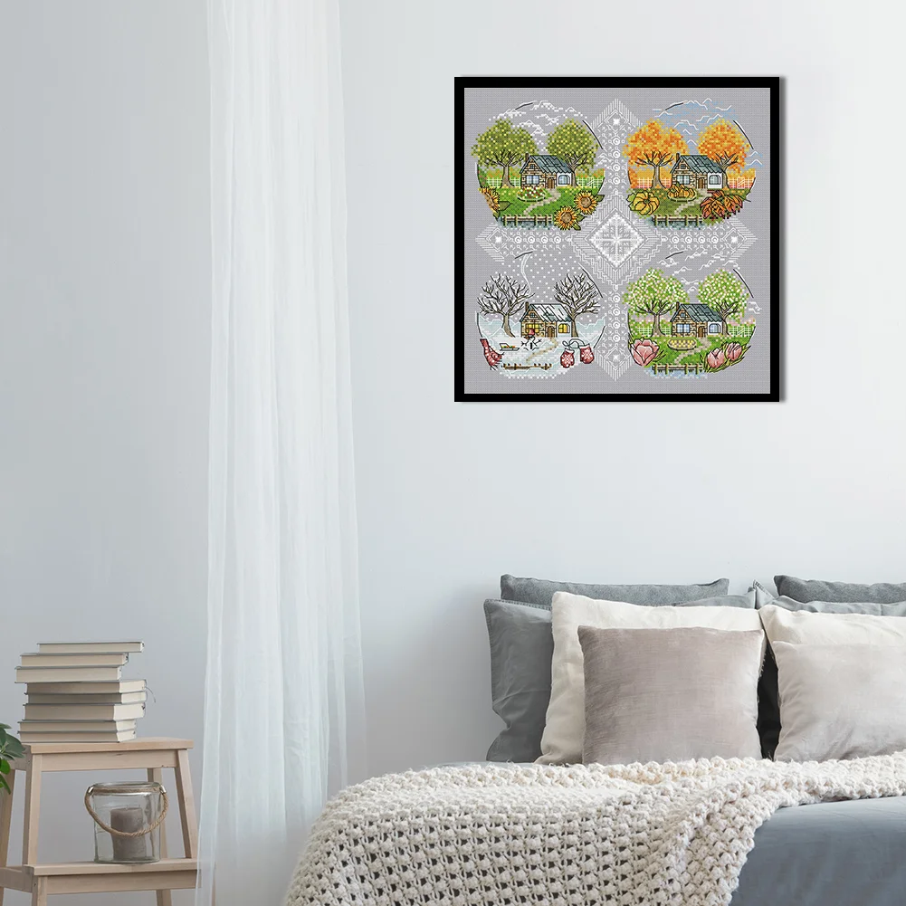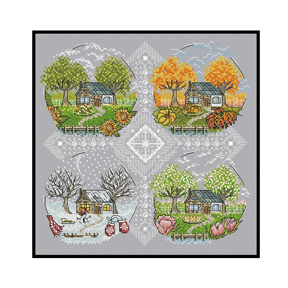 14CT 2 Strands Printed DIY Cottage Seasons Stamped Full Cross Stitch Set Cotton Thread Needlework Embroidery Kits Art Needlework Home Decoration