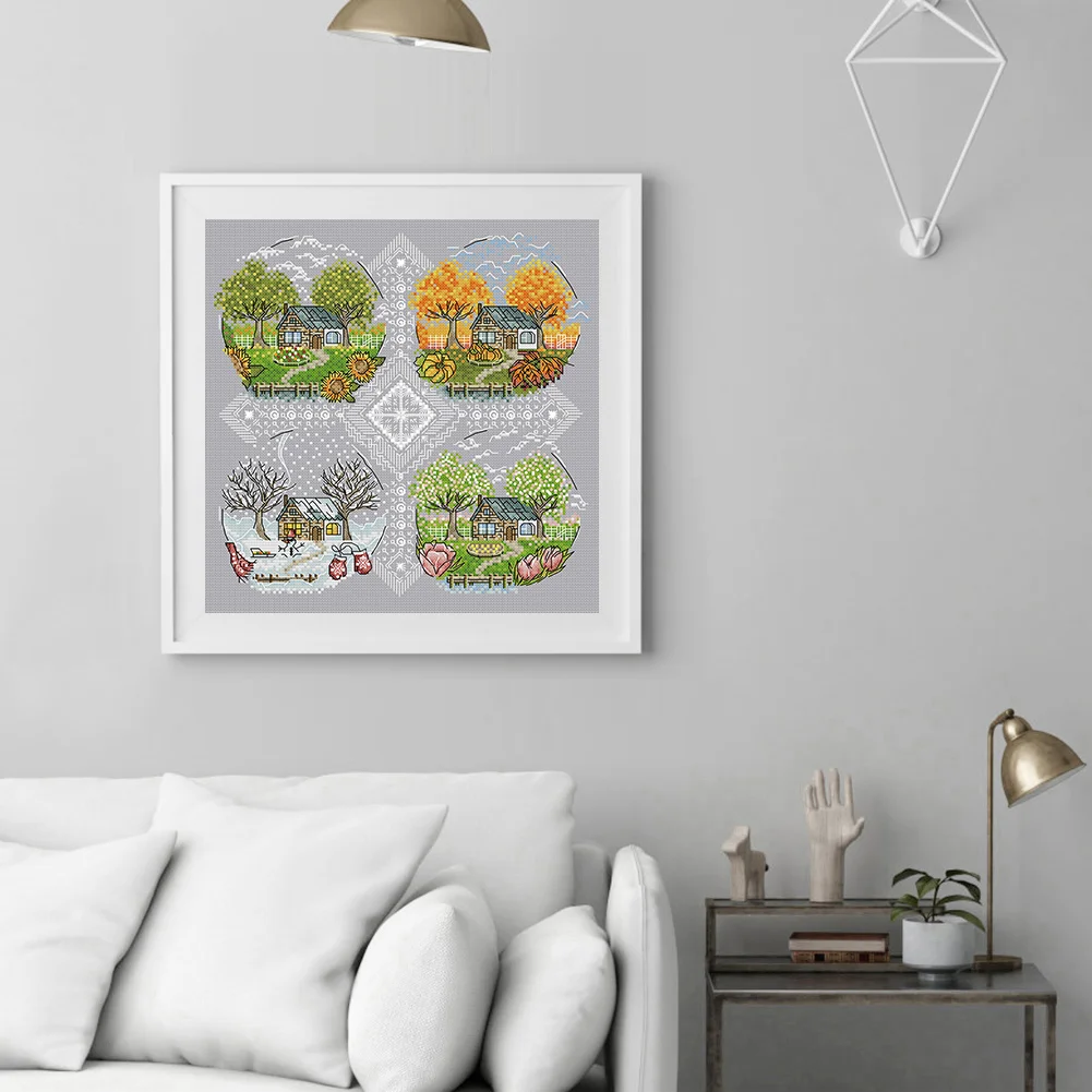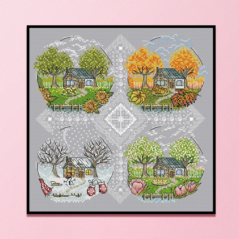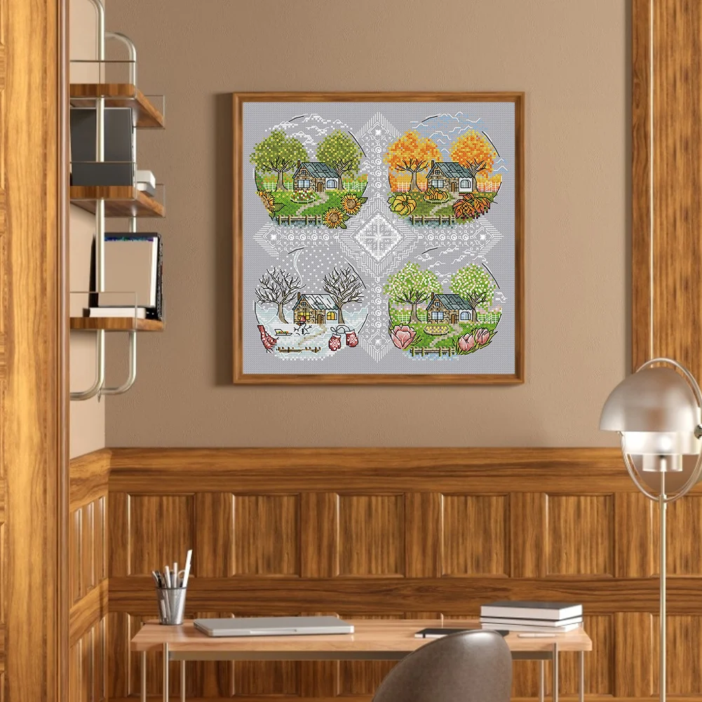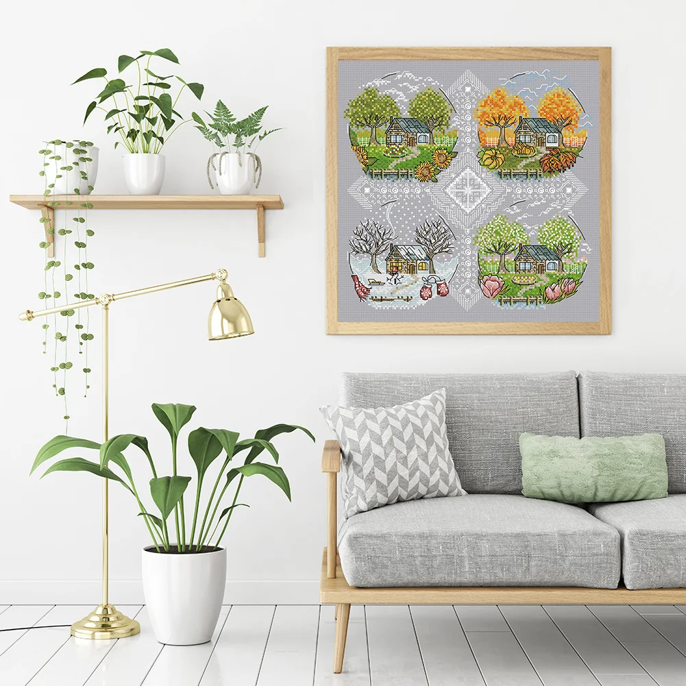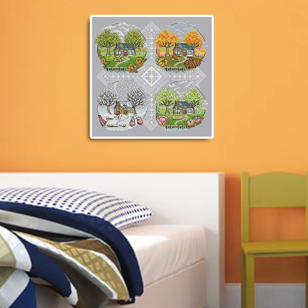 14CT 2 Strands Printed DIY Cottage Seasons Stamped Full Cross Stitch Set Cotton Thread Needlework Embroidery Kits Art Needlework Home Decoration
