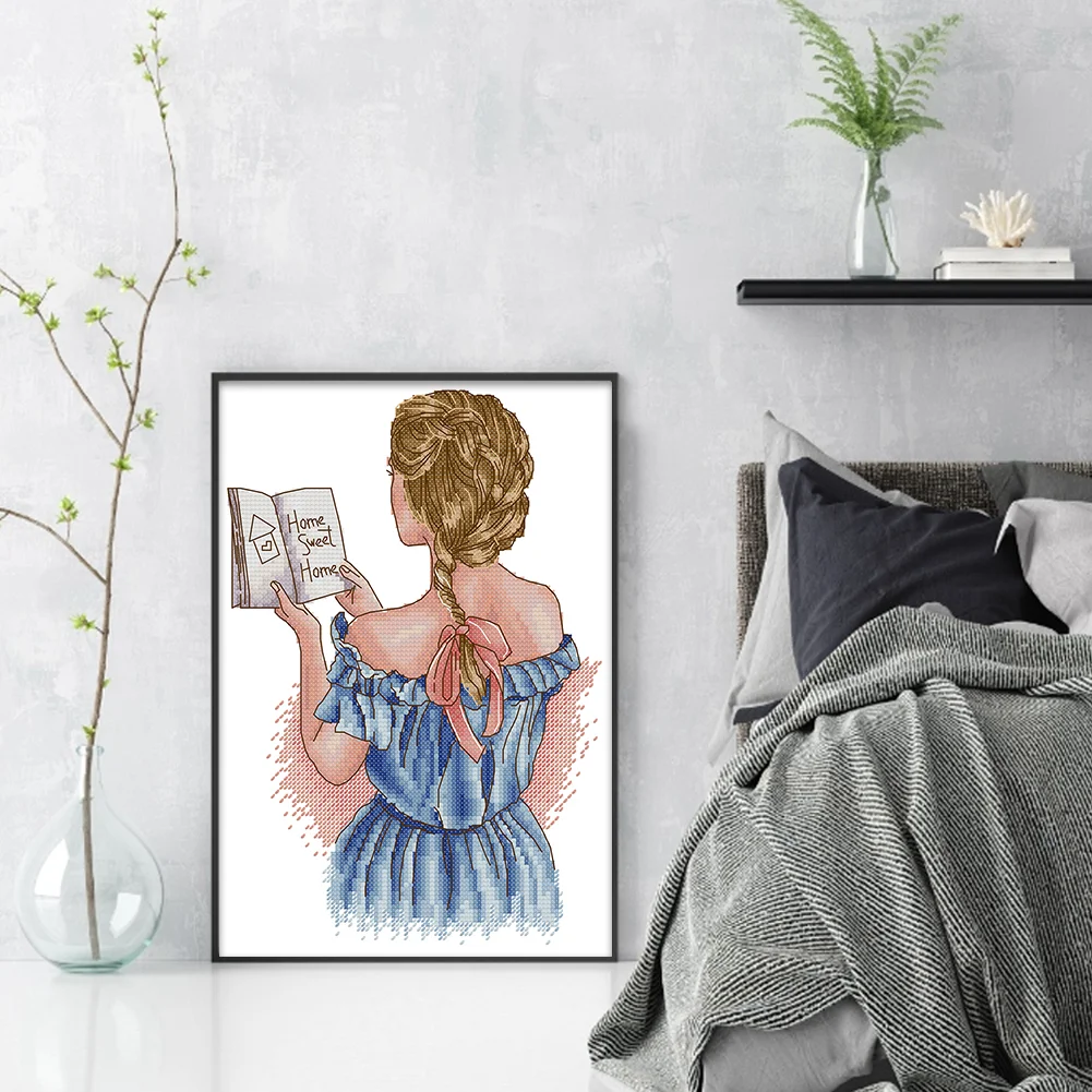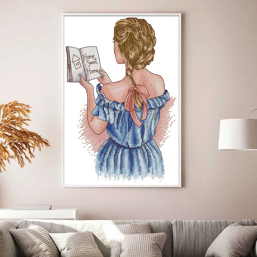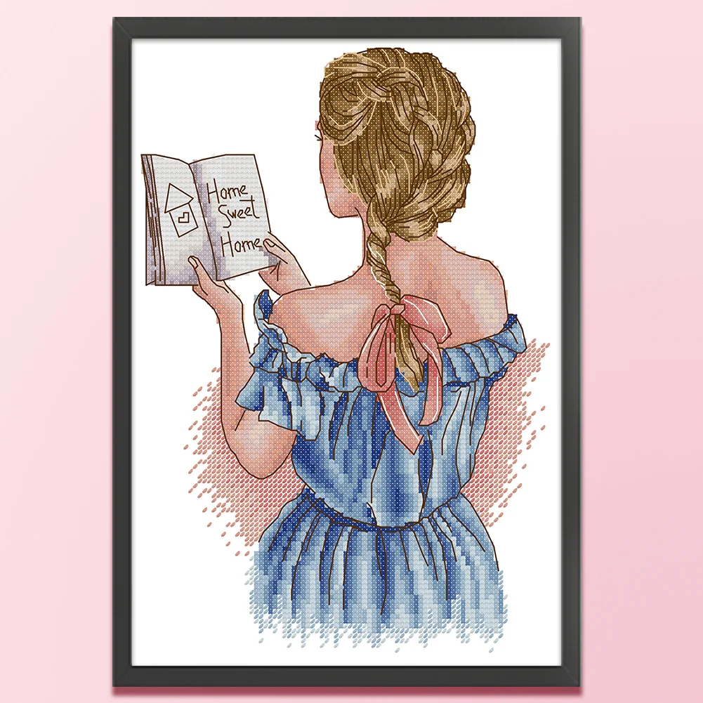 [JOY SUNDAY] -14CT Partial Stamped Cross Stitch Kit - Girl Back Reading Book (21*31CM)