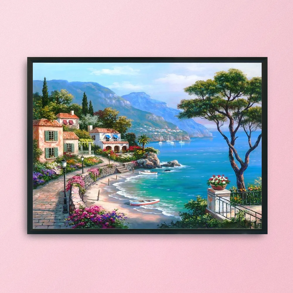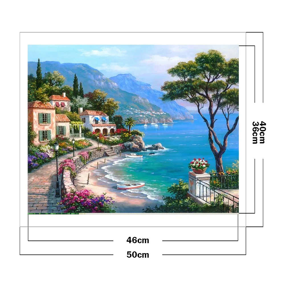 Seaside Town DIY Full Embroidery Set Canvas Cotton Thread Painting Cross Stitch 11CT Stamped Needlework Craft Kits Printed Artworks Home Room Decoration Gifts