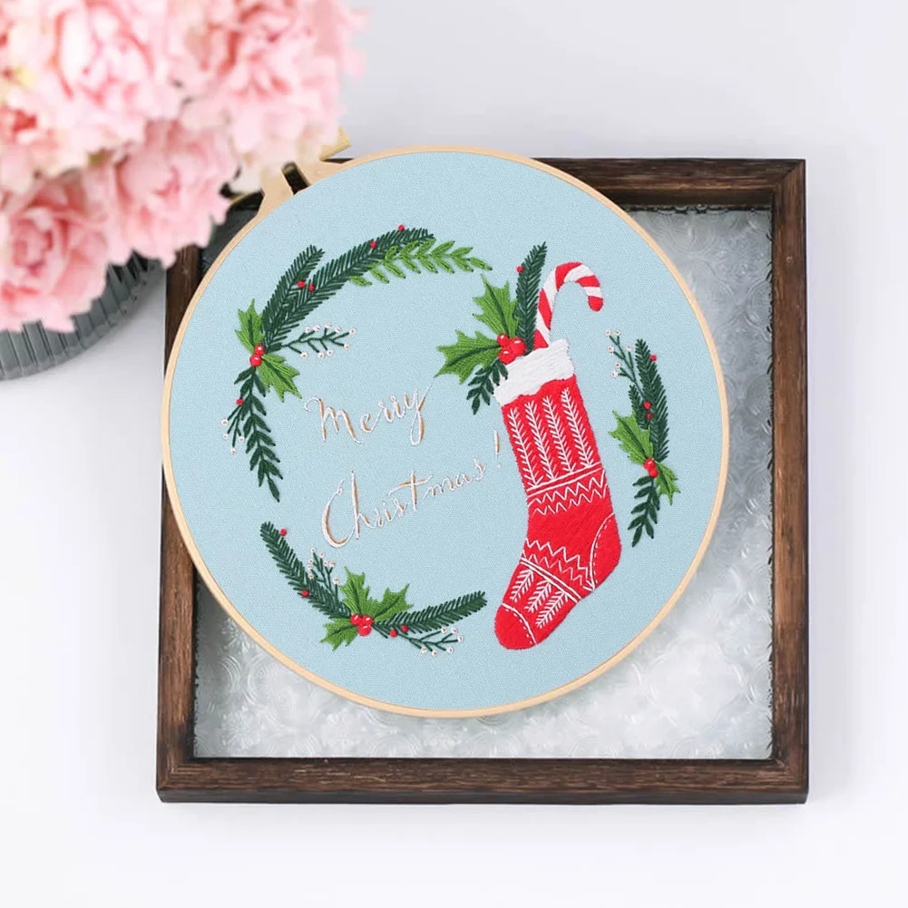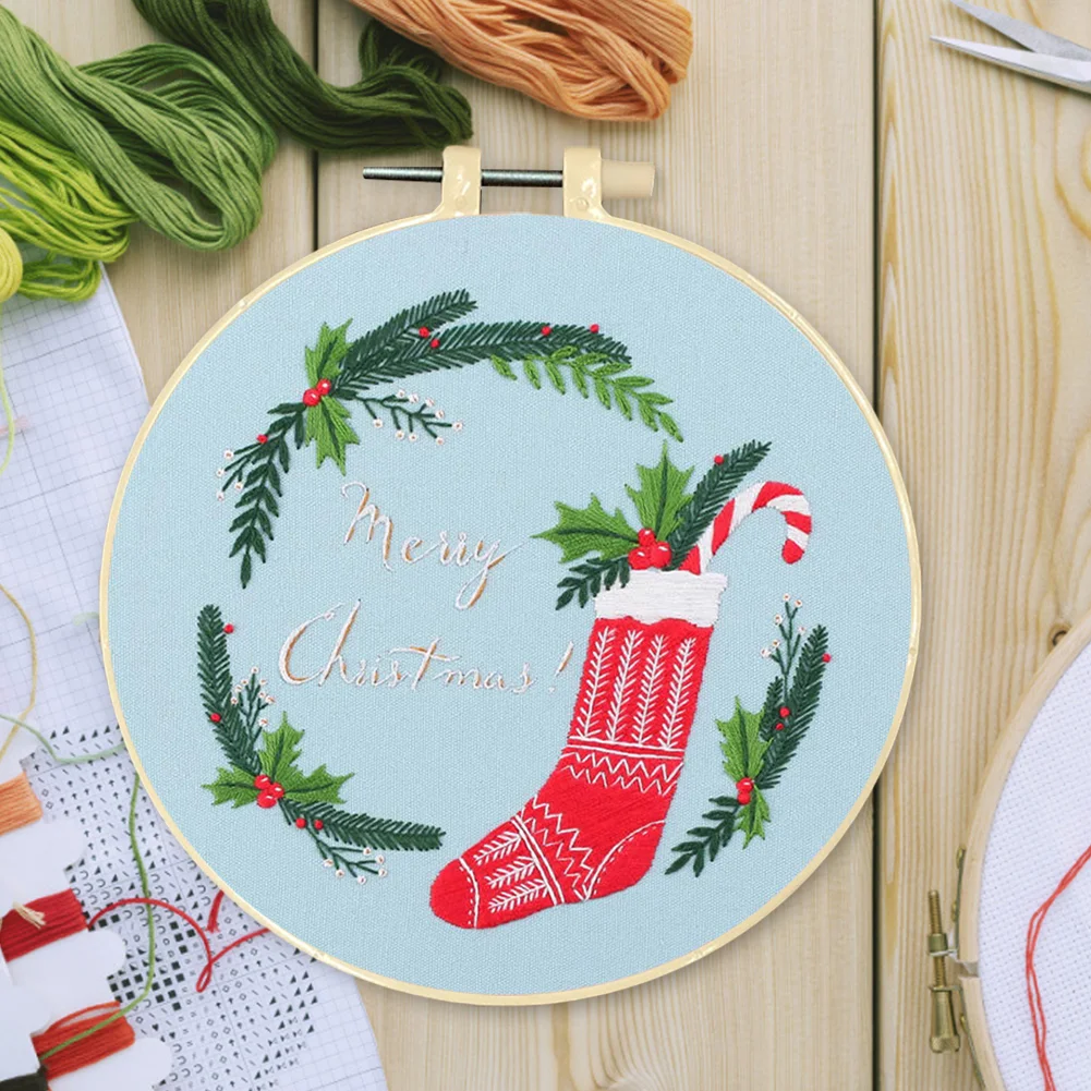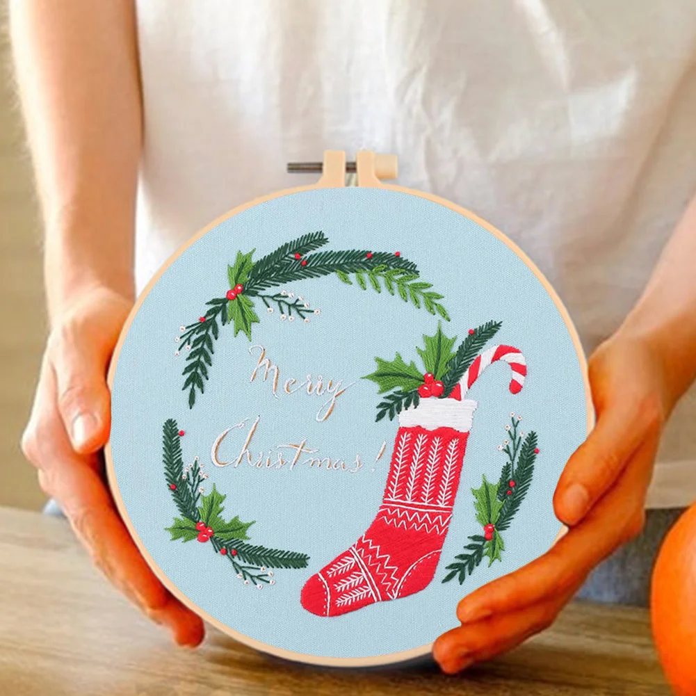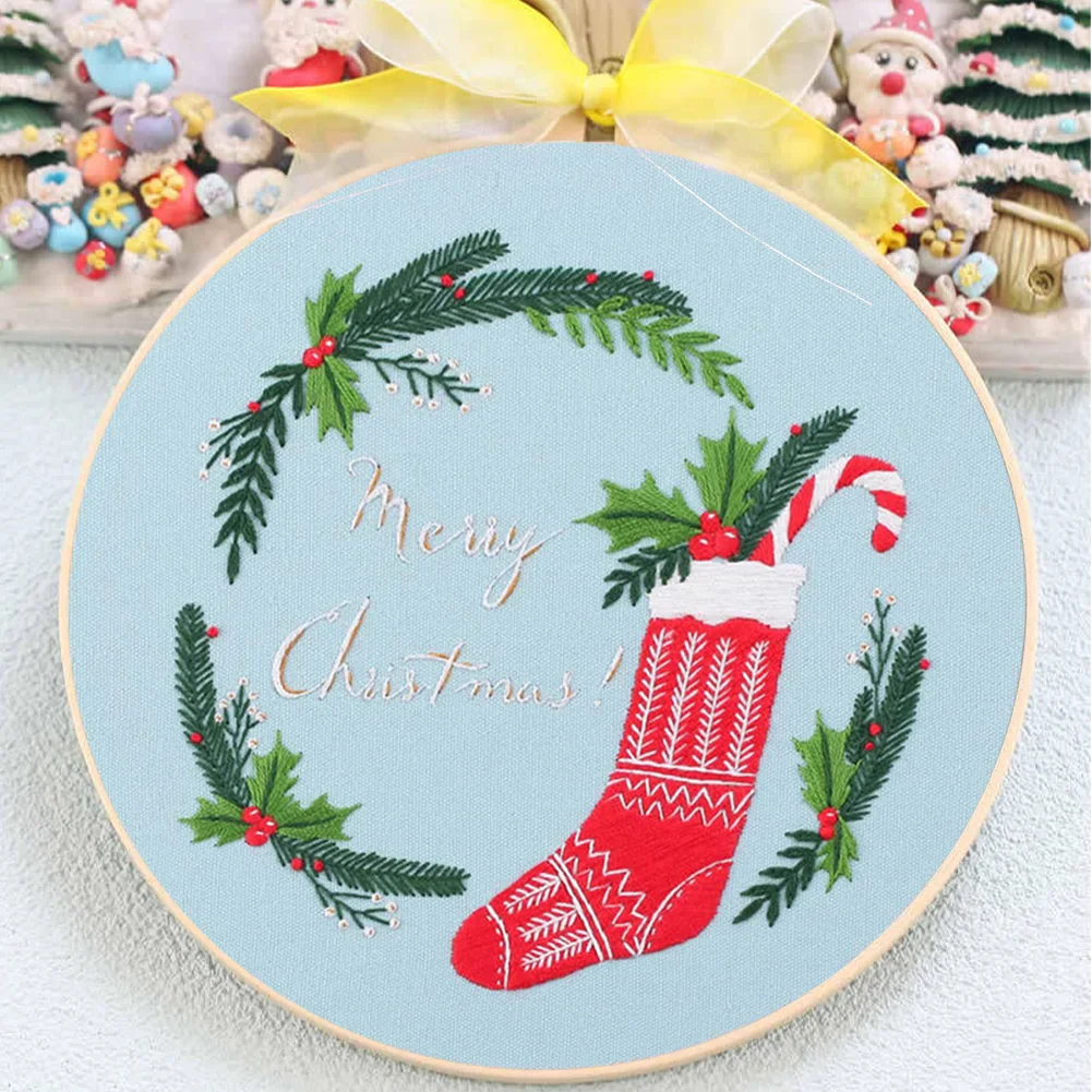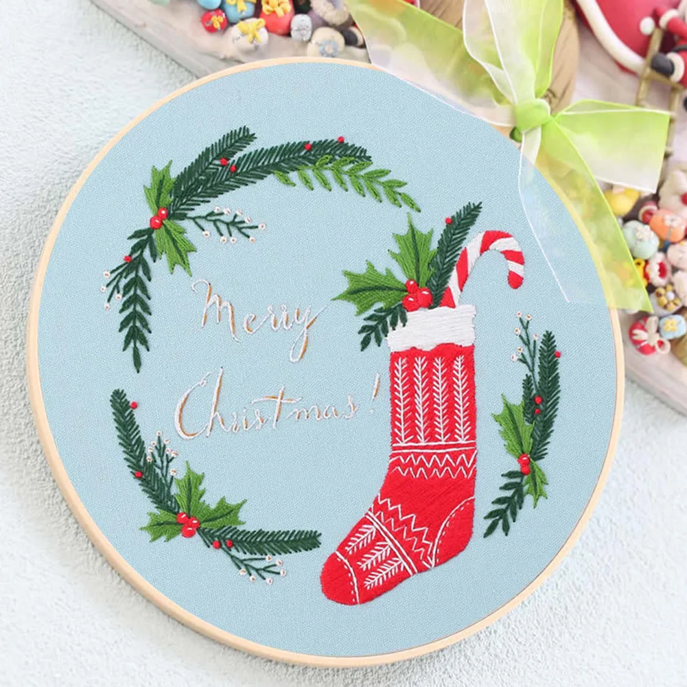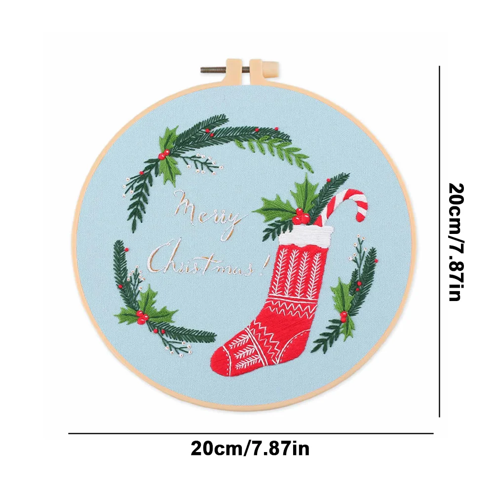 Xmas DIY Embroidery Kit with Pattern Cotton Threads Needles Hoop